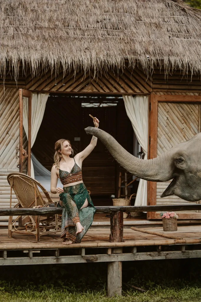 Our elephant photo session was raw and real, not picture-perfect. We were barefoot in the mud, swatting away mosquitoes, trying to stay upright as elephants playfully bumped into us. I was dripping in sweat, covered in river water, and more alive than I’ve felt in a long time.
